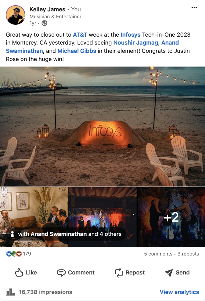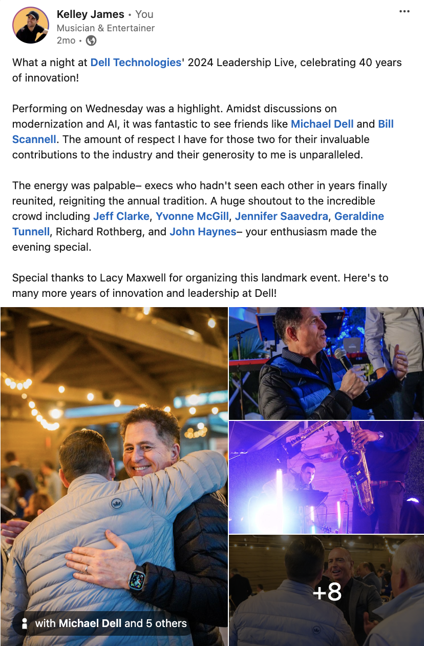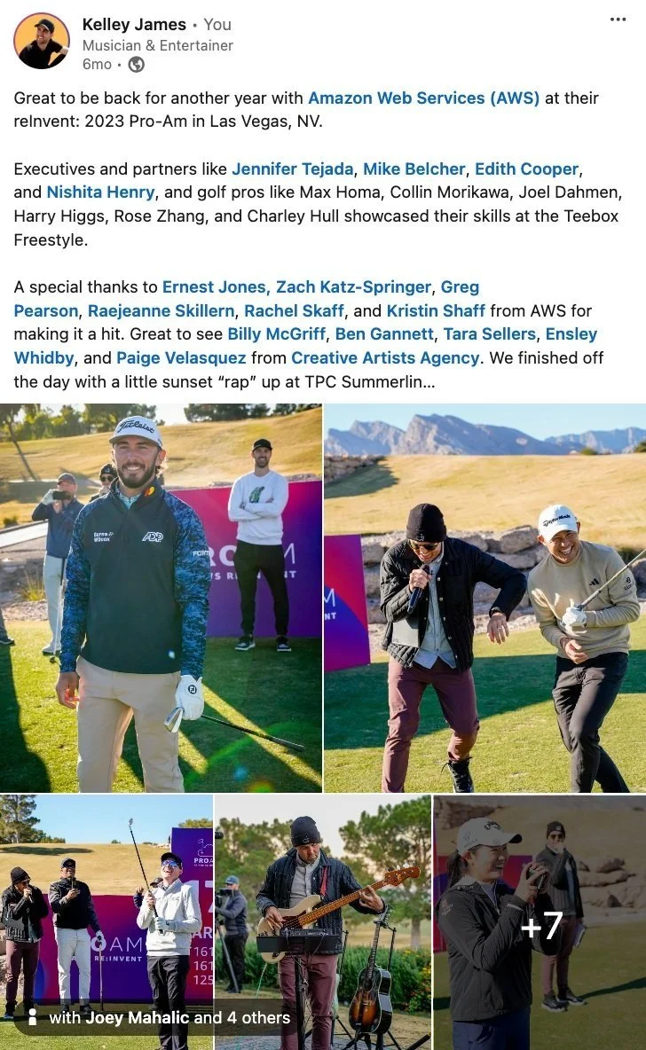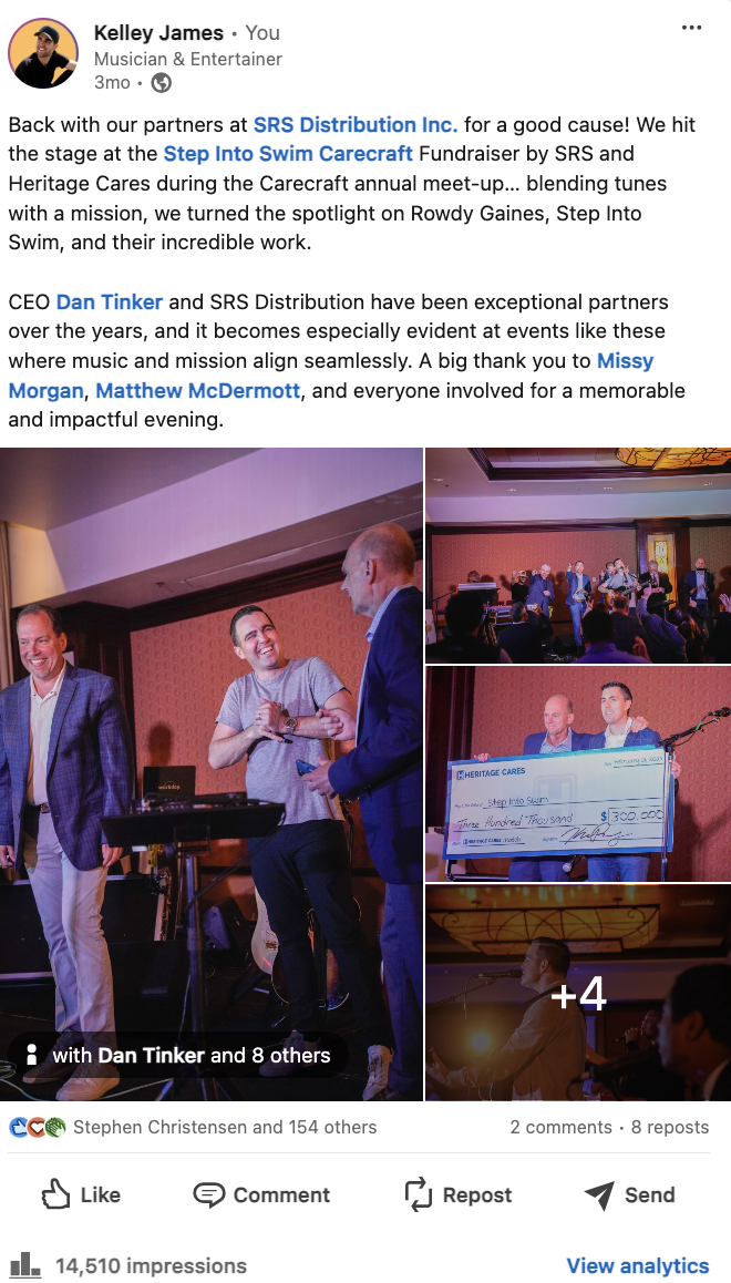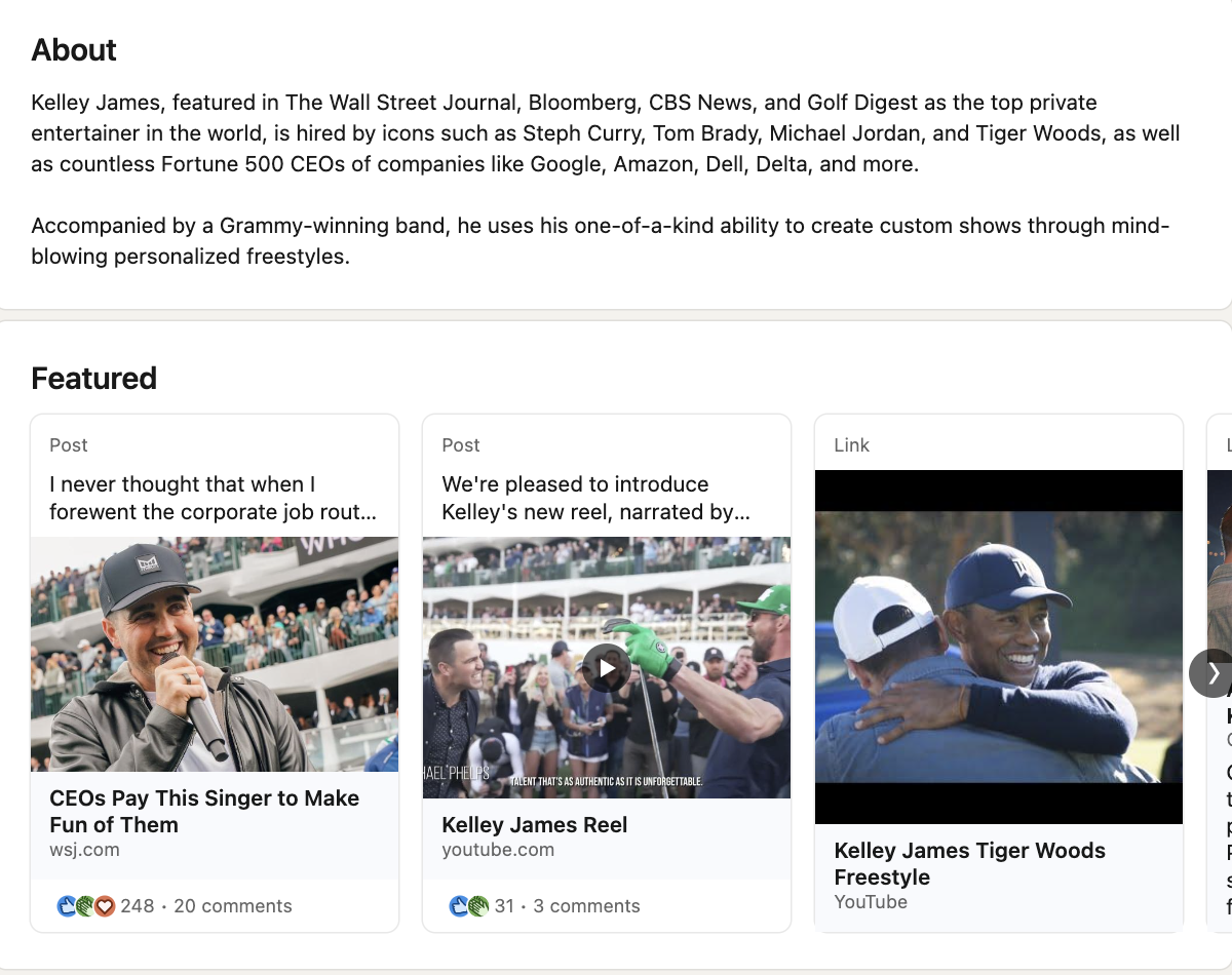 I immediately recognized LinkedIn as an ideal platform to establish Kelley as a private entertainer, particularly with his predominantly corporate audience. I promptly optimized his personal profile by updating his profile picture, cover photos, and refining his bio and title. I applied the same enhancements to our business page, and almost instantly saw growth. Over time, I was able to grow our Entertainmant page’s follower count 10x.